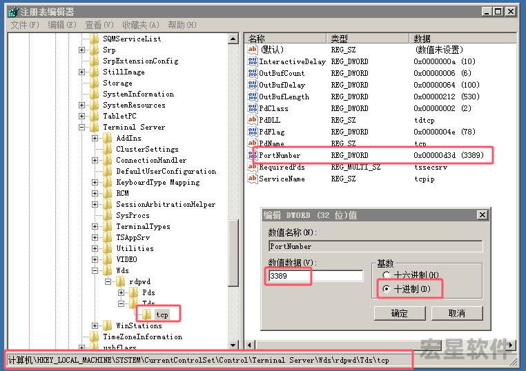 2.找到HKEY_LOCAL_MACHINE\SYSTEM\CurrentControlSet\Control\Terminal Server\Wds\rdpwd\Tds\tcp,修改PortNumber值