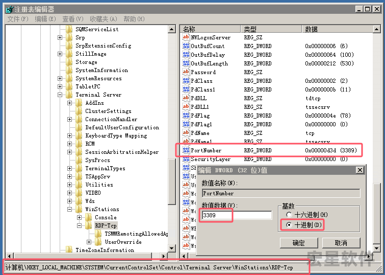 3.找到HKEY_LOCAL_MACHINE\SYSTEM\CurrentContro1Set\Control\Tenninal Server\WinStations\RDP-Tcp,找到PortNumber,值改成和上面一致
