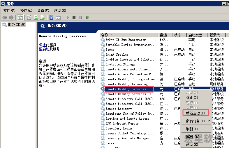 4.开始-->运行-->services.msc重新启动Remote Desktop Services服务生效