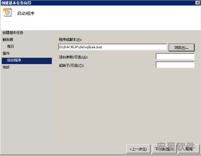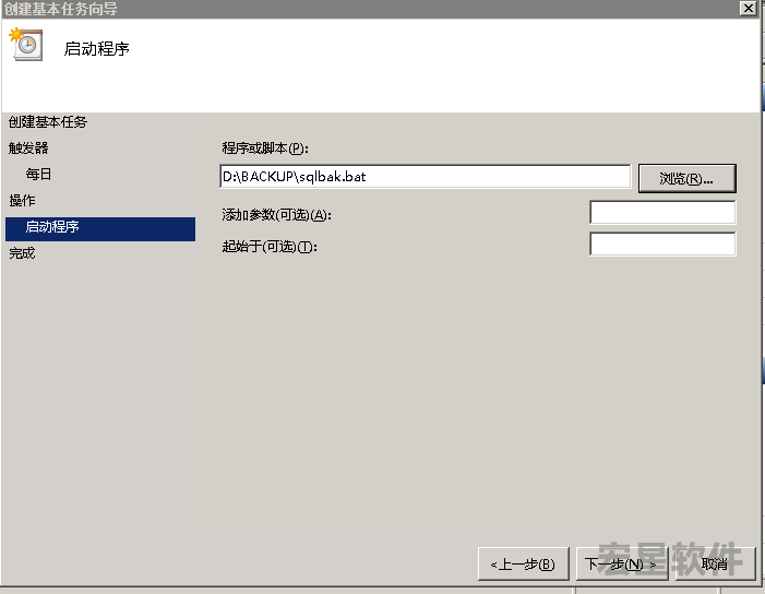 7、通过 浏览,选择先前创建的 sqlbak.bat文件